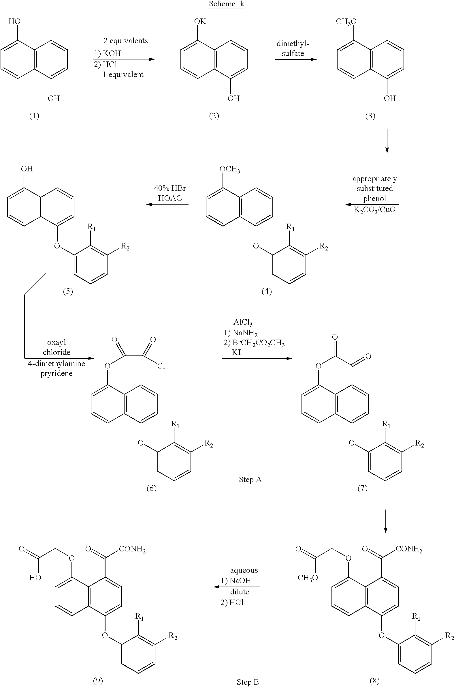In the first step of the above reaction scheme, an appropriately substituted 1-bromo-4-methylnapthalene and an appropriately substituted phenol are dissolved in an aprotic polar solvent such as pyridine. The mixture is treated with an excess of potassium carbonate and an excess of copper-bronze and refluxed under a nitrogen blanket to produce (1).