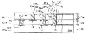 - the contact pads 112 , 113 , and 104 are electrically connected to the contact pads 122 , 123 , and 124 through the plugs 126 a , 127 a , and 130 , respectively.