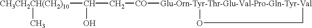 Another cyclic lipopeptide compound produced by B. subtilis is surfactin, which possesses an exceptional surfactant activity (Kaninuma et al. (1969) Agric. Biol. Chem. 33:973-976). Surfactin contains a C14 or C15 .beta.-hydroxy fatty acid linked by a lactone ring to a heptapeptide moiety with a LLDLLDL (SEQ ID NO:8) sequence (Arima et al. (1968) Biochem. Biophys. Res. Commun. 31:488-494. Sandrin et al. ((1990) Biotechnol. Appl. Biochem. 12:370-375) found B. subtilis strains that produced both surfactin and iturin A, the bacillomycins F and L and mycosubtilin.