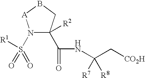 Compounds of this invention were prepared in DMSO at 100× the desired final assay concentration. Final concentrations were selected from a range between 0.001 nM-100 μM. Three μL of diluted compound, or vehicle alone, were premixed with 300 μL of cell suspension in 96-well polystyrene plates with round bottom wells. 100 μL aliquots of the cell/compound mixture were then transferred in duplicate to CS-1 coated wells. The cells were next incubated for 30 minutes at room temperature. The non-adherent cells were removed by two gentle washings with PBS. The remaining adherent cells were quantitated by reading the plates on a Cytofluor II fluorescence plate reader (Perseptive Biosystems Inc., Framingham, Mass.; excitation and emission filter settings were 485 nm and 530 nm, respectively). Control wells containing vehicle alone were used to determine the level of cell adhesion corresponding to 0% inhibition. Control wells coated with BSA and crosslinker (no CS-1 peptide) were used to determine the level of cell adhesion corresponding to 100% inhibition. Cell adhesion to wells coated with BSA and crosslinker was usually less than 5% of that observed to CS-1 coated wells in the presence of vehicle. Percent inhibition was then calculated for each test well and the IC50 was determined from a ten point titration using a validated four parameter fit algorithm.