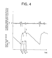 - FIGS. 3 and 4 show two cuff-pulse-wave signals SM having respective different waveforms, and their respective fourth-order-differentiated waveforms, and each of the FIGS. 3 and 4 shows the corresponding one signal SM and its differentiated waveform along a common time axis, and additionally shows a peak point P of an incident-wave component of the one signal SM, a time t P of occurrence of the peak point P, a peak point R of a reflected-wave component of the one signal SM, and a time t R of occurrence of the peak point R.