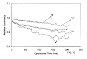 FIG. 10 is a graph showing the luminance as a function of operation time, relative to the initial luminance, for green emitting OLEDs of one composition according to the present invention; and