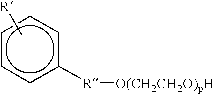 where p represents 2 to 40 or 4 to 15 or 2 to 15 or 2, 3, 4, 5, 6, 7, 8, 9, or 10 and R′ represents hydrogen, (C1-C3)alkyl, (C1-C3)alkoxy, or (C1-C3)alkenyl and R″ represents a bond or (C1-C3)alkyl, (C1-C3)alkoxy, or (C1-C3)alkenyl. Preferred ethoxylates are those derived from phenol itself and benzyl alcohol and those containing 2 to 15 ethoxylate groupings. Especially preferred is “Ethylan HB4” which is a phenol ethoxylate containing around 4 ethoxylate units.