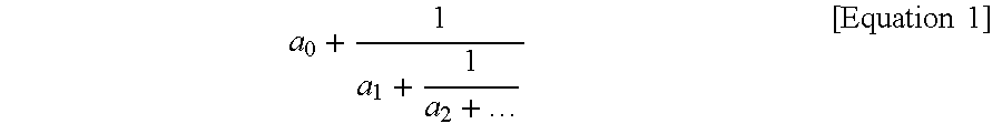 - Equation 1 The continued fraction expansion of real number x is expressed by Equation 1 which follows. a 0 + 1 a 1 + 1 a 2 + ... [ Equation ⁇ ⁇ 1 ]