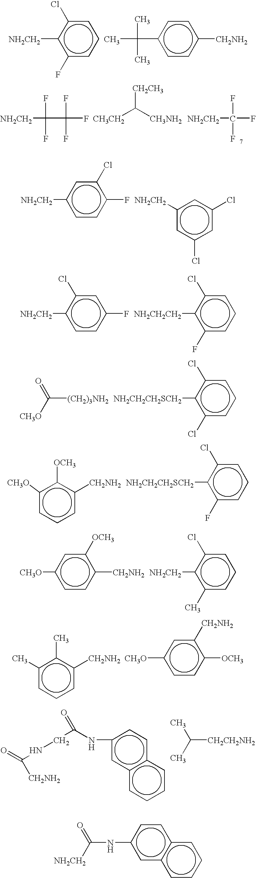 The seven encoded 5.7 g. batches of resin from Step 5(a) are placed in 200 mL round bottom flasks. The seven encoded 1.4 g. batches from Step 3(c) are placed in 50 mL round bottom flasks. To each of the fourteen flasks is added a solution of 10o glacial acetic acid in methanol (60 mL in the 200 mL flasks, 15 mL in the SO mL flasks). The appropriate amine for Table 2-6 (ca 40 equiv.) is added followed by sodium cyanoborohydride (ca 40 equiv.). Condensers are attached and the mixtures are heated to 75° C. for 48 hr. The resin is washed with alternating DCM and methanol (5× each) and then with EtOAc (2×).