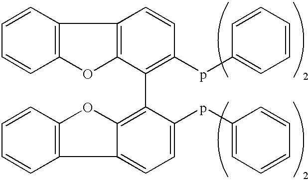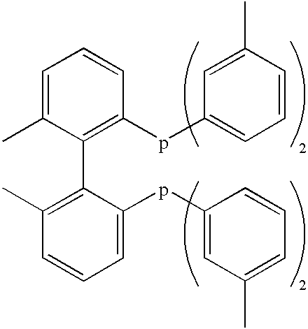In this manner a variety of chiral ruthenium dicarboxylate diphosphine, including those listed in Example 16, can be prepared. The process for preparing a ruthenium dicarboxylate diphosphine compound generally involves contacting [RuCl2(COD)]n, which is commercially available or preferably prepared according to the procedure of Albers et al., Inorg. Synth., 1989, 26, 68, with a mixture of a carboxylate salt and the corresponding carboxylic acid, i.e., MOC(═O)R′ and HOC(═O)R′ mixture, such as sodium acetate/acetic acid and sodium pivalate/pivalic acid mixtures, in an aprotic organic solvent, preferably toluene. The mixture is heated at a temperature of about 80° C. to about 120° C., preferably about 100° C. A typical reaction time is from about 15 hours to about 72 hours, preferably from about 20 hours to about 48 hours. The amount of carboxylate salt used can be about 2 equiv. to about 50 equiv., preferably about 2 equiv. to about 25 equiv., more preferably about 2.1 equiv. to about 10 equiv., and most preferably about 2.5 equiv. Preferably a small excess of [RuCl2(COD)]n is used relative to the diphosphine compound to ensure complete conversion of the diphosphine compound.