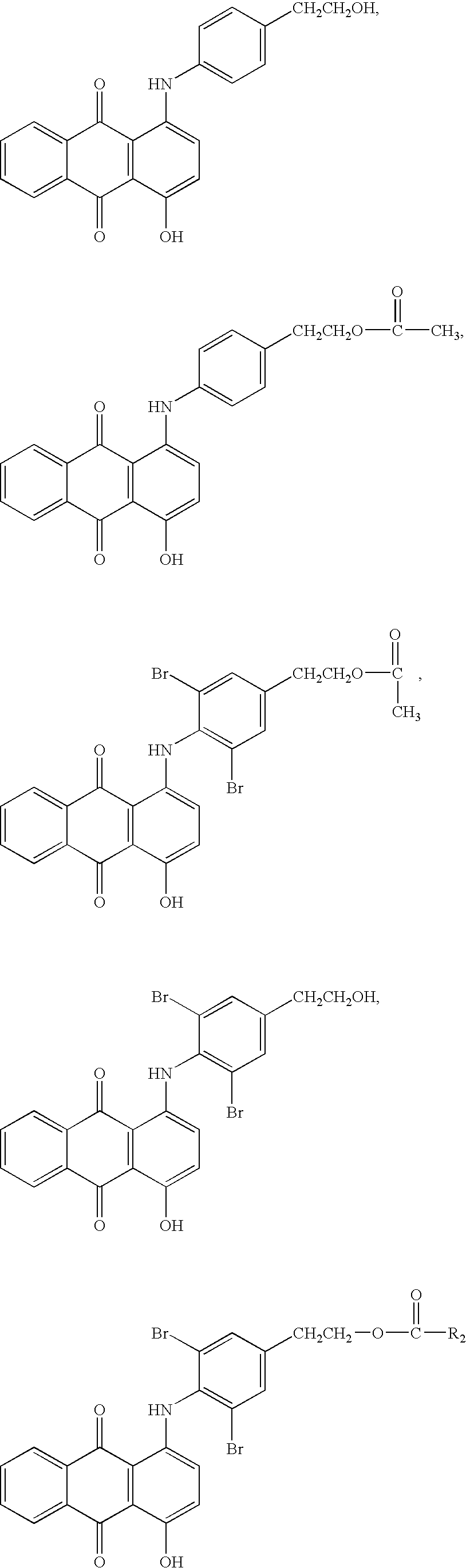 - JJKWMAHPYLBRMC-UHFFFAOYSA-N C.CC(=O)OCCC1=CC(Br)=C(NC2=CC=C(O)C3=C2C(=O)C2=CC=CC=C2C3=O)C(Br)=C1.CCCCCCCC(CCCCCCCCCCC(=O)OCCC1=CC=C(NC2=CC=C(O)C3=C2C(=O)C2=CC=CC=C2C3=O)C=C1)C(CCCCCCC)CCCCCCCCCCC(=O)OCCC1=CC=C(NC2=C/C=C(O)/C3=C\2C(=O)C2=CC=CC=C2C3=O)C=C1.[H]N(C(=O)OCCC1=CC=C(NC2=CC=C(O)C3=C2C(=O)C2=CC=CC=C2C3=O)C=C1)C1CC(C)(C)CC(C)(CNC(=O)OCC2(C)CCC3(C)C(CCC4CC(C(C)C)CCC43)C2)C1 Chemical compound C.CC(=O)OCCC1=CC(Br)=C(NC2=CC=C(O)C3=C2C(=O)C2=CC=CC=C2C3=O)C(Br)=C1.CCCCCCCC(CCCCCCCCCCC(=O)OCCC1=CC=C(NC2=CC=C(O)C3=C2C(=O)C2=CC=CC=C2C3=O)C=C1)C(CCCCCCC)CCCCCCCCCCC(=O)OCCC1=CC=C(NC2=C/C=C(O)/C3=C\2C(=O)C2=CC=CC=C2C3=O)C=C1.[H]N(C(=O)OCCC1=CC=C(NC2=CC=C(O)C3=C2C(=O)C2=CC=CC=C2C3=O)C=C1)C1CC(C)(C)CC(C)(CNC(=O)OCC2(C)CCC3(C)C(CCC4CC(C(C)C)CCC43)C2)C1 JJKWMAHPYLBRMC-UHFFFAOYSA-N 0.000 description 1