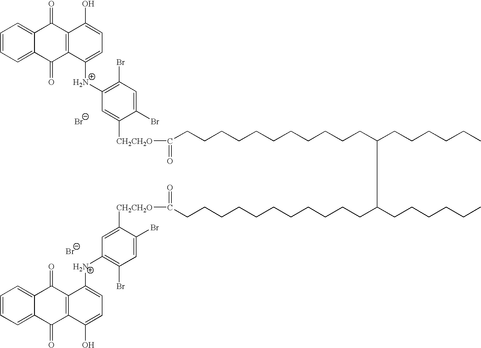 - OXGQTNFHVYHGDL-UHFFFAOYSA-P CCCCCCC(CCCCCCCCCCCC(=O)OCCC1=CC([NH2+]C2=CC=C(O)C3=C2C(=O)C2=CC=CC=C2C3=O)=C(Br)C=C1Br)C(CCCCCC)CCCCCCCCCCCC(=O)OCCC1=CC([NH2+]C2=C\C=C(O)/C3=C\2C(=O)C2=CC=CC=C2C3=O)=C(Br)C=C1Br.[Br-].[Br-] Chemical compound CCCCCCC(CCCCCCCCCCCC(=O)OCCC1=CC([NH2+]C2=CC=C(O)C3=C2C(=O)C2=CC=CC=C2C3=O)=C(Br)C=C1Br)C(CCCCCC)CCCCCCCCCCCC(=O)OCCC1=CC([NH2+]C2=C\C=C(O)/C3=C\2C(=O)C2=CC=CC=C2C3=O)=C(Br)C=C1Br.[Br-].[Br-] OXGQTNFHVYHGDL-UHFFFAOYSA-P 0.000 description 1
