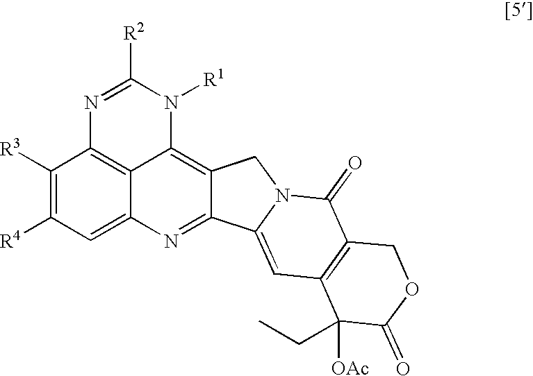 To a solution of (9S)-9-acetoxy-9-ethyl-1-(3-methylbutyl)-2-methylsulfinyl-1H,12H-pyrano[3″,4″:6′,7′]indolizino[1′,2′:6,5]pyrido[4,3,2-de]quinazoline-10,13(9H,15H)-dione (6.4 mg, 0.01 mmol) in 1,4-dioxane (1.0 ml) was added n-butylamine (30 μl, 0.3 mmol). The mixture was stirred at 100° C. for 5 hr, and then stirred at room temperature for 2 days. After concentrated under reduced pressure, the obtaining residue was purified by column chromatography (dichloromethane/acetone=10/1) to give the product (5.4 mg, 83%) as a yellow powder.