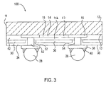 Several bottom conductors or ball pads 38 are located over portions of insulating layer 34. Short cylindrical vias 54 extend through insulating layers 42 and 34 and ground plane 30. Vias 54 are filled with a conductive via fill material 52.