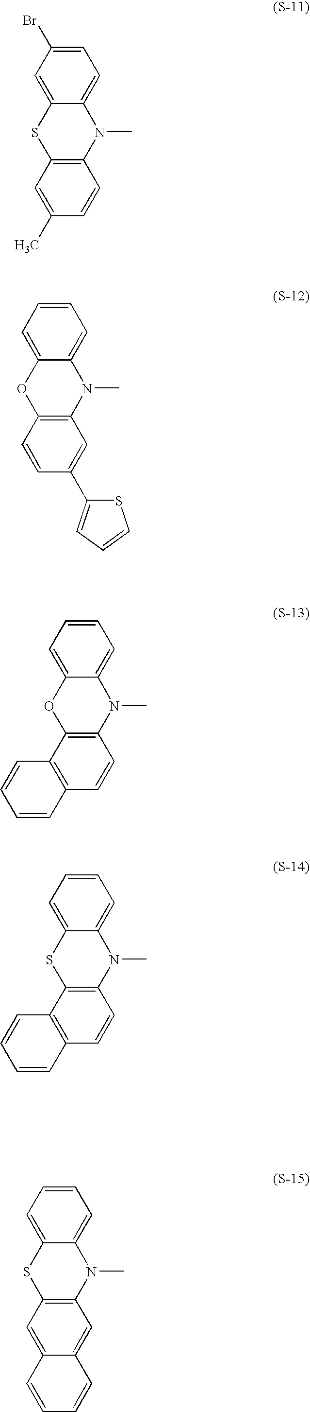 - the present inventors have found that when the constituent element (2), namely, Compound A, which is capable of phosphorescence emission at room temperature, is used in combination with the constituent element (3), namely Compound B, which is (a) phosphorescent compound not capable of emitting light with high efficiency by itself, or which is (b) a fluorescent compound capable of emitting light in various colors but incapable of ensuring light emission efficiency as high as that of the phosphorescent compound for any of those colors, Compound A plays a role of sensitizer, and the light emission of Compound B is intensified.