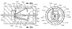- a helical compression spring 104 is contained in a largely compressed state in longitudinal cavity 105 within the guard body 106, with its free end 125 pressing against the locking plate 102 of the lever 101 and urging the level 101 axially against the sloping internal face 107 of body 106, making contact at pivot point 108.