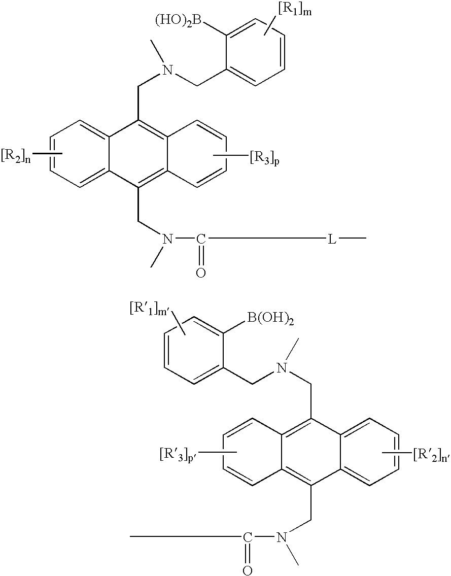 In other exemplary embodiments of the invention, the fluorescent sensor compound selectively binds glucose; m, m′, n, n′, p, and p′ are each zero; and the L group of the fluorescent compound is