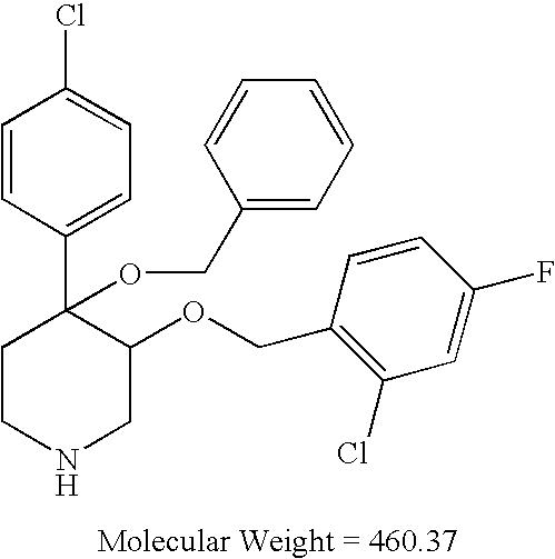 - NOJUMHYPGFCDQC-UHFFFAOYSA-N FC1=CC(F)=CC(COC2CNCCC2(OCC2=CC=CC=C2)C2=CC=C(Cl)C=C2)=C1 Chemical compound FC1=CC(F)=CC(COC2CNCCC2(OCC2=CC=CC=C2)C2=CC=C(Cl)C=C2)=C1 NOJUMHYPGFCDQC-UHFFFAOYSA-N 0.000 description 1