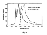 FIG. 10 shows the emission spectrum of both Pt(ppy)2 and Pt(ppy)2Br2. The former gives green emission, partly from MLCT transitions, and the latter gives blue emission, predominantly from a triplet π-π * transition. The structure observed for the Pt(ppy)2Br2 spectrum is consistent with ligand-centered emission. The luminescent lifetimes for the two complexes are 4 and 150 microseconds.