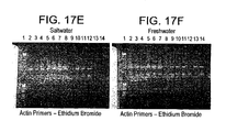 FIGS. 17A-F are graphical representations comparing six photographs of Reverse Transcriptase Polymerase Chain Reaction (RT-PCR) analysis of freshwater (FIGS. 17B, D and F) and seawater (FIGS. 17A, C and E) adapted Atlantic salmon tissues (gill, nasal lamellae, urinary bladder, kidney, stomach, pyloric caeca, proximal intestine, distal intestine, brain, pituitary gland, olfactory bulb, liver and muscle) using either degenerate PVCR (FIGS. 17A-D) or salmon actin PCR primers (FIGS. 17E,F). Wells 1-14 for FIGS. 17A-F, top row, are designated as follows: ladder, gill, nasal lamellae, urinary bladder, kidney, stomach, pyloric caeca, proximal intestine, distal intestine, brain, pituitary gland, olfactory bulb, liver and muscle, respectively. Wells 1, 2, 7, 9, and 12, bottom row, for FIGS. 17A, C, and E are designated as ladder, water, SalmoKCaR #1, SalmoKCaR#2 and SalmoKCaR#3, respectively, and wells 1, 2, 3, 7, 9, and 12, bottom row, for FIGS. 17B,D, and F are designated as ladder, water, ovary, SalmoKCaR #1, SalmoKCaR#2 and SalmoKCaR#3, respectively.