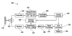 FIG. 8 illustrates a block diagram of an ultrasonic diagnostic imaging system 200 constructed in accordance with an embodiment of the present invention. The system includes a transducer array 210 that is coupled via a transmit/receive switch 220 with a transmitter 230 and receiver 240. Stepped-chirp waveforms [#1˜#N] (N=1, 2, . . . ) are transmitted sequentially via stepped-chirp waveform generator 250 and transmitter 230 controlled by transmitter controller 260.