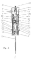 - the conical surface area 20 of the coupling member 17 engages the webs 25 , which are thereby pushed toward each other so that the locking hooks of the webs 25 are pushed off the shoulder 26 , whereby the coupling member 23 is released ( FIG. 36 ) so that the pressurized piston 4 can impel the cannula 21 over and toward the front of the biopsy needle 18 .