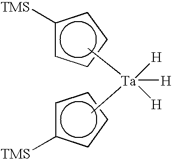 - a general synthetic scheme for compounds of formula (1) is set out below when addition of R′ groups to the tantalum center are desired: [(R) n Cp] 2 TaH 3 +R′Li ⁇ (RCp) 2 TaH 2 R′+1 ⁇ 2H 2 (B) which can be repeated in a stepwise manner until addition of same or differing R′ groups is complete.