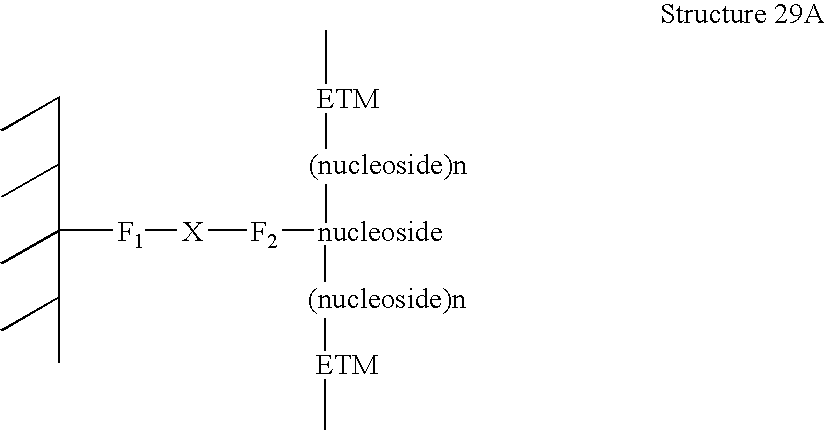 - the invention also provides methods of making the compositions of the invention comprising providing a conductive oligomer covalently attached to a nucleoside; and attaching said conductive oligomer to said electrode.