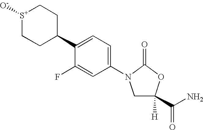 - MLBUAZDLUXTTBI-JHQYKTOJSA-N [H][C@]1(C(N)=O)CN(C2=CC=C(C3=CCS(=O)CC3)C(F)=C2)C(=O)O1 Chemical compound [H][C@]1(C(N)=O)CN(C2=CC=C(C3=CCS(=O)CC3)C(F)=C2)C(=O)O1 MLBUAZDLUXTTBI-JHQYKTOJSA-N 0.000 description 1
