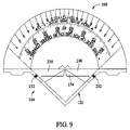 FIG. 7 illustrates the face 108 of the guide portion 102 in more detail, and particularly wherein exemplary indicia and marking of the face 108 is shown. In the exemplary embodiment, the face 108 includes angular degree indicia extending along the inner 105 of the guide portion 102, and slope indicia (expressed in, for example, inch rise per foot or degree of incline) along the outer edge 106. Further, for the user's convenience, and in acknowledgment of the tool being used in several different orientations or positions, several different varieties of each of the angular indicia and the slope indicia are provided. For example, and as illustrated in FIG. 7, a innermost scale of angular indicia is provided which indicates in incrementing marks or bar lines, an angle of 0° to 180° extending from a left hand edge 210 in FIG. 7 to a right hand edge 212 of the guide portion 102. An intermediate scale of angular indicia is provided adjacent the innermost scale and the intermediate scale indicates an angle of 0° to 180° extending from the right hand edge 212 to the left hand edge 210. A third or outermost scale of angular indicia, which also serves to indicate degree of incline, is provided which indicates an angle of 0° to 90° measured from a centerline 214 of the guide portion 102 to either of the left or right hand edges 210 and 212. Thus, angles may conveniently be measured, determined or established from left, right, and center positions when the tool is located on a workpiece.