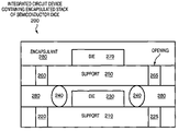 The encapsulant is formed contiguously, in a continuous and unbroken connection, in the different void regions of the stack of dice by flowing to the regions through the plurality of encapsulant flow openings 220, 225 and 260, 265 of the respective supports 210 and 250, and solidifying in these regions. As shown, the encapsulant has solidified the surfaces of the dice, the surfaces of the support on opposite sides of the dice, between the dice, between the supports, around the connectors and within the flow openings. Once solidified, the encapsulant provides a protective and mechanically integral packaging for the dice. It is contemplated that the contiguous, seamless, and integral encapsulation of the stack of dice may provide improved strength and reduced blistering, peeling, and other separations due to thermal and mechanical stresses.
