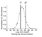 - FIG. 8 Illustration of how intensity encoding is accomplished. Acquisition of the primary spectrum (1°) is carried out at the LMCO value shown by the solid line, and acquisition of the secondary spectrum (2°) is carried out at the LMCO value shown by the dotted line. The ion intensity change is then predicted using equation 1.