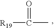 - C 1 –C 20 hydrocarbon-based group means a C 1 –C 20 aliphatic chain, such as a C 6 –C 18 aliphatic chain which may be interrupted with at least one (ranging from 1 to 5) hetero atoms, for example, chosen from nitrogen, oxygen, sulphur and phosphorus, this chain possibly comprising at least one entity chosen from (from 1 to 5) aromatic rings, (from 1 to 5) aromatic and saturated heterocycles, (from 1 to 5) aliphatic rings, or possibly being substituted with at least one (from 1 to 5) group chosen from hydroxyl, carboxyl, (C 1 –C 4 )alkoxycarbonyl, hydrogenocarbonyl, C 1 –C 4 alkoxy, C 2 –C 4 acyl, amino, mono- and dialkylamino, mono- and di(C 1 –C 4 hydroxyalkyl)amino, cyano, nitro and sulphonato groups.