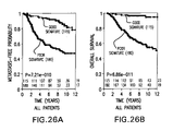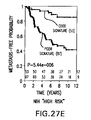 A key question is whether the prognosis profile is a more useful clinical tool to determine eligibility for adjuvant systemic treatment than the presently used “St. Gallen” and “NIH-consensus” criteria, which are based on histological and clinical characteristics (see Goldhirsch et al., Meeting Highlights: International Consensus Panel on the Treatment of Primary Breast Cancer, Seventh International Conference on Adjuvant Therapy of Primary Breast Cancer, J. Clin. Oncol. 19(18):3817–3827 (2001); Eifel et al., National Institutes of Health Consensus Development Conference Statement: Adjuvant Therapy for Breast Cancer, Nov. 1–3, 2000, J. Natl. Cancer Inst. 93(13):979–989 (2001)). FIG. 27 shows the Kaplan-Meier metastasis-free curves for the 151 lymph node negative patients, where the patients were classified as “good prognosis/low-risk” or “poor prognosis/high-risk” using the prognosis profile (FIG. 27A), the “St. Gallen” (FIG. 27B) or the “NIH-consensus” criteria (FIG. 27C).