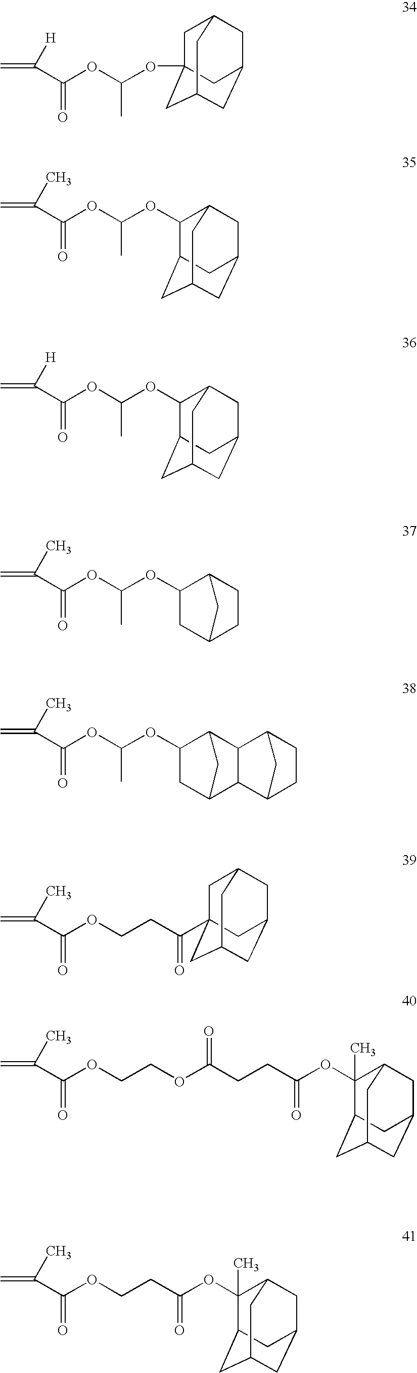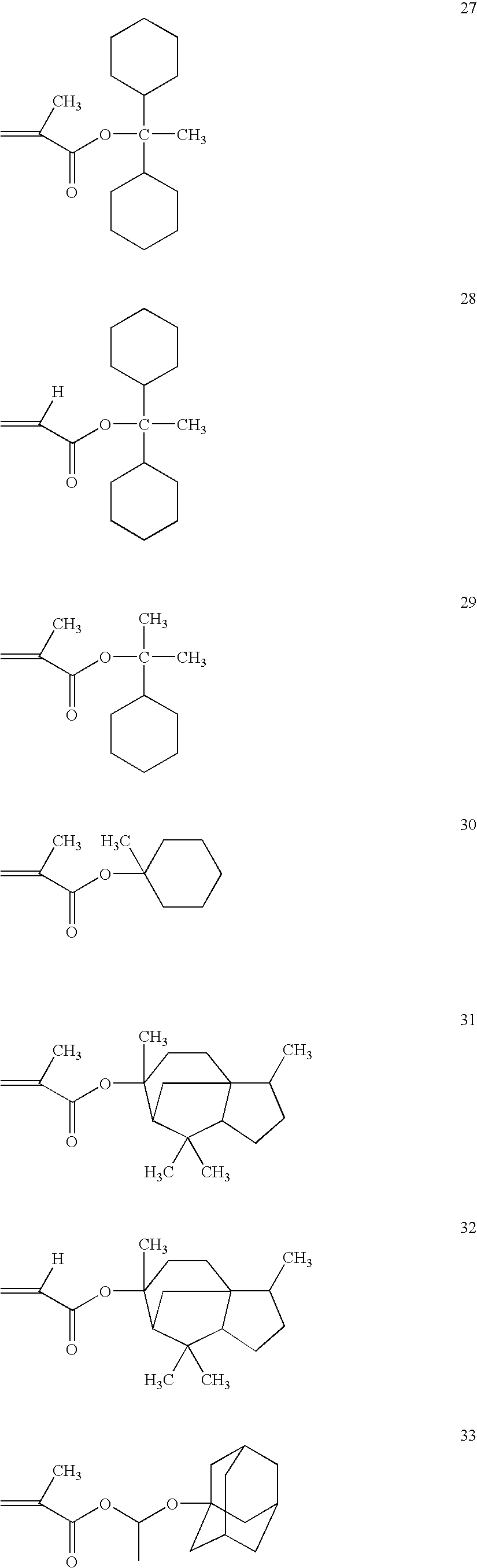 Also, JP-A-2001-109154, JP-A-2000-137327, JP-A-2002-296783, and JP-A-2001-215704 describe positive working photoresist compositions containing a copolymer resin of the foregoing lactone monomer and a monomer having a hydroxyadamantane structure as a polar group-containing alicyclic functional group.