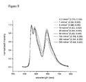 FIG. 6 shows the plots of the normalized emission spectra at various current densities for a device of FIG. 3 were the Emissive Region has the structure mCP:Ir(F2CNppy)2(pic)(6%,200 Å)/CBP:Ir(pq)2(acac)(6%,50 Å)/CBP:Irppy(6%,50 Å).