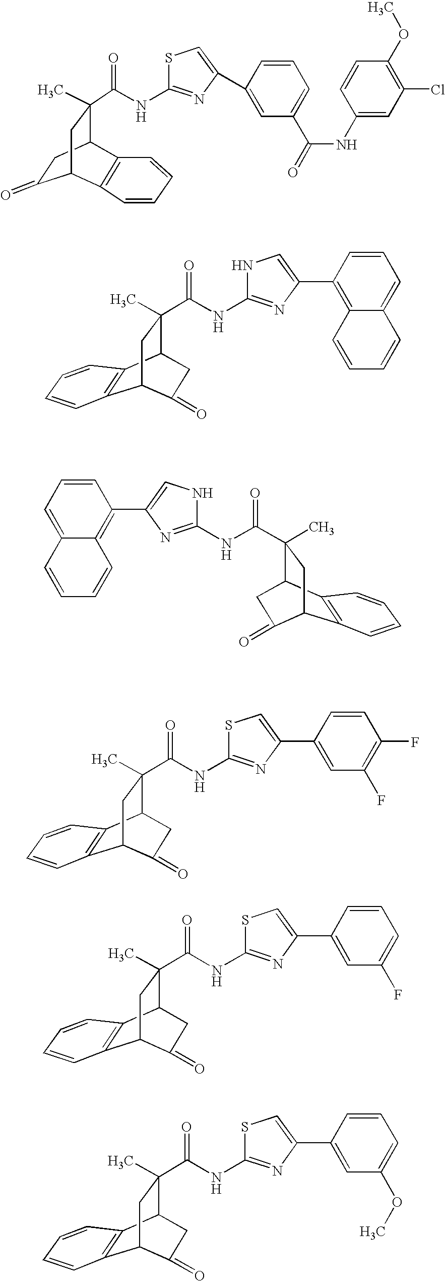 - NDEUVOOCWVTPFV-UHFFFAOYSA-N CC1(C(=O)NC2=NC(C3=C4C=CC=CC4=CC=C3)=CS2)CC2C(=O)CC1C1=C2C=CC=C1.CC1(C(=O)NC2=NC(C3=CC(C#N)=CC=C3)=CS2)CC2C(=O)CC1C1=C2C=CC=C1.CC1(C(=O)NC2=NC(C3=CC(Cl)=CC=C3)=CS2)CC2C(=O)CC1C1=C2C=CC=C1.CC1(C(=O)NC2=NC(C3=CC=C(F)C=C3)=CS2)CC2C(=O)CC1C1=C2C=CC=C1.CC1=C2C=CC=CC2=C(C2=CSC(NC(=O)C3(C)CC4C(=O)CC3C3=C4C=CC=C3)=N2)C=C1.CC1=CC=CC(C2=CSC(NC(=O)C3(C)CC4C(=O)CC3C3=C4C=CC=C3)=N2)=C1.CSC1=CC=CC(NC(=O)C2=CC=CC(C3=CSC(NC(=O)C4(C)CC5C(=O)CC4C4=C5C=CC=C4)=N3)=C2)=C1 Chemical compound CC1(C(=O)NC2=NC(C3=C4C=CC=CC4=CC=C3)=CS2)CC2C(=O)CC1C1=C2C=CC=C1.CC1(C(=O)NC2=NC(C3=CC(C#N)=CC=C3)=CS2)CC2C(=O)CC1C1=C2C=CC=C1.CC1(C(=O)NC2=NC(C3=CC(Cl)=CC=C3)=CS2)CC2C(=O)CC1C1=C2C=CC=C1.CC1(C(=O)NC2=NC(C3=CC=C(F)C=C3)=CS2)CC2C(=O)CC1C1=C2C=CC=C1.CC1=C2C=CC=CC2=C(C2=CSC(NC(=O)C3(C)CC4C(=O)CC3C3=C4C=CC=C3)=N2)C=C1.CC1=CC=CC(C2=CSC(NC(=O)C3(C)CC4C(=O)CC3C3=C4C=CC=C3)=N2)=C1.CSC1=CC=CC(NC(=O)C2=CC=CC(C3=CSC(NC(=O)C4(C)CC5C(=O)CC4C4=C5C=CC=C4)=N3)=C2)=C1 NDEUVOOCWVTPFV-UHFFFAOYSA-N 0.000 description 1