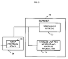 Referring to FIG. 3, there is shown some of the internal components of network box 24 and scanner 22. Scanner 22 has several conventional components (e.g., drum, motors, etc.) that are not shown in FIG. 3. Network box 24 includes TCP/IP protocol stack/hardware (Ethernet, IEEE 802.11b, Bluetooth, or whatever) stack 70 that is linked to hardware (not shown—an Ethernet connector or radio transceiver, for example). Scanner 22 includes application web server 72, wherein an XML page or document of the control panel description (of scanner 22) is stored. Scanner 22 also includes a storage unit 74 for storing message and address information sent along with the SOAP command (discussed below). Network box 24 is connected to scanner 22. The message and address information are stored for later insertion into the XML document when requested by a user.