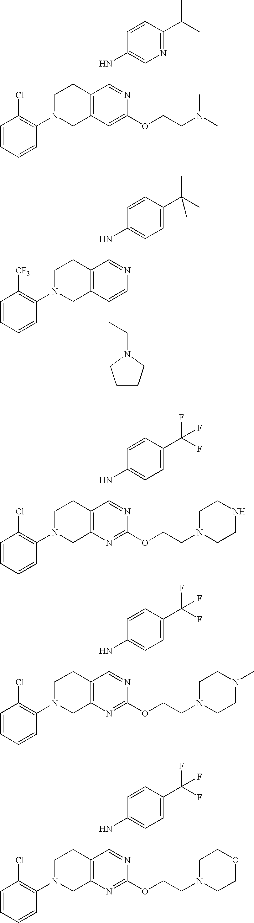 - CILDLZKQHFYGAN-UHFFFAOYSA-N n-(4-tert-butylphenyl)-7-(3-chloropyridin-2-yl)-2-methoxy-6,8-dihydro-5h-pyrido[3,4-d]pyrimidin-4-amine Chemical compound N=1C(OC)=NC=2CN(C=3C(=CC=CN=3)Cl)CCC=2C=1NC1=CC=C(C(C)(C)C)C=C1 CILDLZKQHFYGAN-UHFFFAOYSA-N 0.000 claims description 6