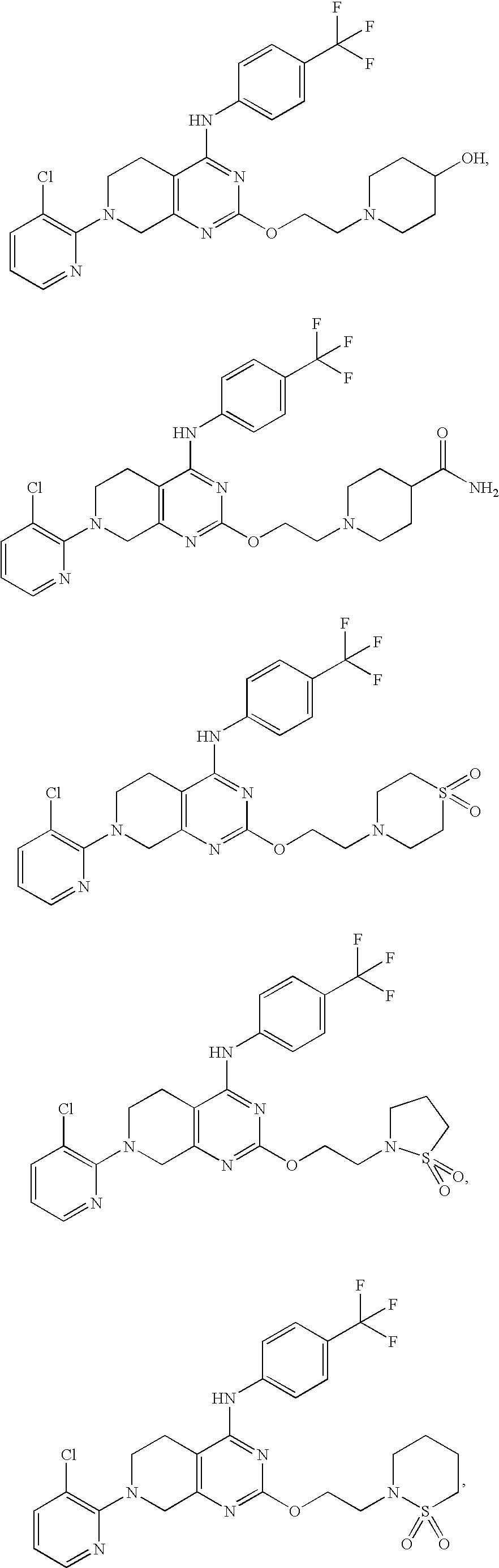 - ZYNPVMNVSYTWEV-UHFFFAOYSA-N 7-(3-chloropyridin-2-yl)-2-methylsulfonyl-n-[4-(trifluoromethyl)phenyl]-6,8-dihydro-5h-pyrido[3,4-d]pyrimidin-4-amine Chemical compound N=1C(S(=O)(=O)C)=NC=2CN(C=3C(=CC=CN=3)Cl)CCC=2C=1NC1=CC=C(C(F)(F)F)C=C1 ZYNPVMNVSYTWEV-UHFFFAOYSA-N 0.000 claims description 8