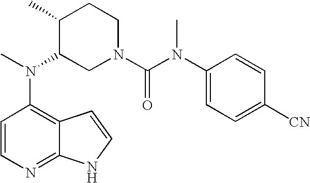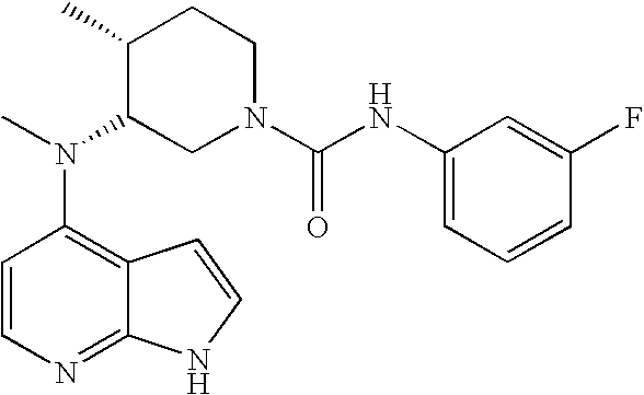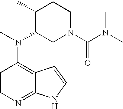 - FGPNUZCDABEMAI-DOMZBBRYSA-N (3r,4r)-n,n,4-trimethyl-3-[methyl(1h-pyrrolo[2,3-b]pyridin-4-yl)amino]piperidine-1-carboxamide Chemical compound C[C@@H]1CCN(C(=O)N(C)C)C[C@@H]1N(C)C1=CC=NC2=C1C=CN2 FGPNUZCDABEMAI-DOMZBBRYSA-N 0.000 claims description 2