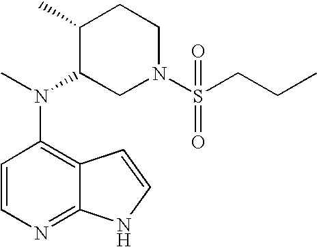 - FEIGMFOQJNOTKI-QRWLVFNGSA-N 4-[(3r,4r)-4-methyl-3-[methyl(1h-pyrrolo[2,3-b]pyridin-4-yl)amino]piperidin-1-yl]sulfonylbenzonitrile Chemical compound C([C@H]([C@H](C1)N(C)C=2C=3C=CNC=3N=CC=2)C)CN1S(=O)(=O)C1=CC=C(C#N)C=C1 FEIGMFOQJNOTKI-QRWLVFNGSA-N 0.000 claims description 4