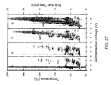 FIG. 24 shows the compensation voltage versus retention time for the 50 peaks of highest intensity in py-GC DMS analyses of E. coli (grey signals) and M. luteus (black signals) for positive polarity ions.
