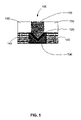 FIG. 4B is a cross-sectional view of an upper electrode 110 forming step of chalcogenide-applied memory cell 300 that includes a tapered dielectric layer 310, in accordance with the second embodiment of the present invention. In this step, a conductive material is deposited to form upper electrode 110 in the cavity formed by chalcogenide layer 120. The cavity formed by chalcogenide layer 120 is substantially filled by upper electrode 110. Upper electrode 110 is formed into a tapered shape adjacent to chalcogenide layer 120. The conductive material of upper electrode 110 can include but is not limited to a metal, metalloid, semiconductor, silicide, or silicon compound, alloy, or composite.