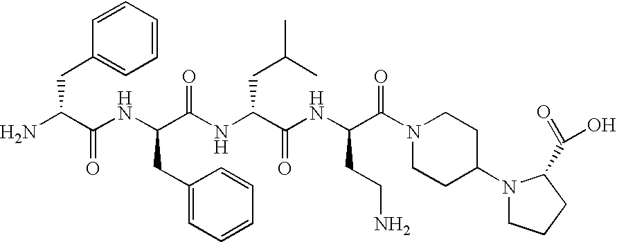D-Phe and substituted D-Phe are examples of a suitable amino acid for residue Xaa1 in Formula I. The phenyl ring can be substituted at any of the 2-, 3- and/or 4-positions. Particular examples of permitted substitutions include, for instance, chlorine or fluorine at the 2- or 4-positions. Also the alpha-carbon atom may be methylated. Other equivalent residues which represent conservative changes to D-Phe can also be used. These include D-Ala(cyclopentyl), D-Ala(thienyl), D-Tyr and D-Tic. The residue at the second position, Xaa2 can also be D-Phe or substituted D-Phe with such substitutions including a substituent on the 4-position carbon of the phenyl ring, or on both the 3- and 4-positions. Alternatively, Xaa2 can be D-Trp, D-Tyr or D-alanine substituted by naphthyl. The third position residue, Xaa3 can be any non-polar amino acid residue, such as for instance, D-Nle, D-Leu, (α-Me)D-Leu, D-Hle, D-Met or D-Val. However, D-Ala(cyclopropyl, cyclobutyl, cyclopentyl or cyclohexyl) or D-Phe can also be used as Xaa3. The fourth position residue Xaa4 can be any positively charged amino acid residue, such as for instance, D-Arg and D-Har, which can be optionally substituted with lower alkyl groups, such as one or two ethyl groups. Alternatively, D-Nar and any other equivalent residues can be used, such as, for instance, D-Lys or D-Orn (either of which can be ω-amino group alkylated, for example by methyl or isopropyl groups, or methylated at the α-carbon group). Moreover, D-Dbu, D-4-Amf (which can be optionally substituted with amidino), and D-Hlys are also suitable amino acids at this position.