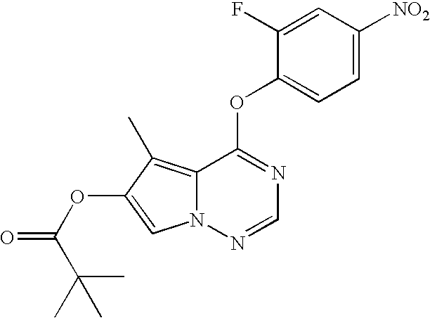 - MTQDDECUYLJWIM-UHFFFAOYSA-N CC1=C2C(OC3=CC=C([N+](=O)[O-])C=C3F)=NC=NN2C=C1OC(=O)C(C)(C)C Chemical compound CC1=C2C(OC3=CC=C([N+](=O)[O-])C=C3F)=NC=NN2C=C1OC(=O)C(C)(C)C MTQDDECUYLJWIM-UHFFFAOYSA-N 0.000 description 4