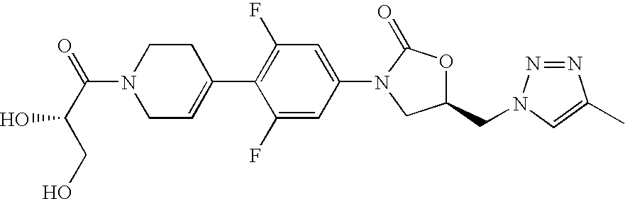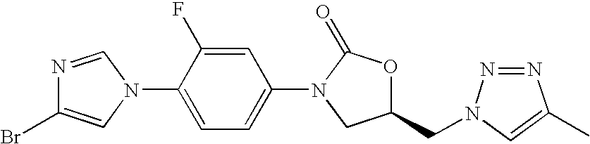 - QHFFLZNHEYCWCQ-NRFANRHFSA-N (5r)-3-[4-(1-benzyl-3,6-dihydro-2h-pyridin-4-yl)-3,5-difluorophenyl]-5-[(4-methyltriazol-1-yl)methyl]-1,3-oxazolidin-2-one Chemical compound N1=NC(C)=CN1C[C@@H]1OC(=O)N(C=2C=C(F)C(C=3CCN(CC=4C=CC=CC=4)CC=3)=C(F)C=2)C1 QHFFLZNHEYCWCQ-NRFANRHFSA-N 0.000 claims description 7
