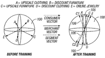 - the relationship strength between each pair of merchants is then mapped into the vector space. This is done by determining the desired dot product between each pair of merchant vectors as a function of the relationship strength between the pair of merchants. This step has the feature that merchant vectors for positively related merchants have a positive dot product, the merchant vectors for negatively related merchants have a negative dot product, and the merchant vectors for unrelated merchants have a zero dot product.