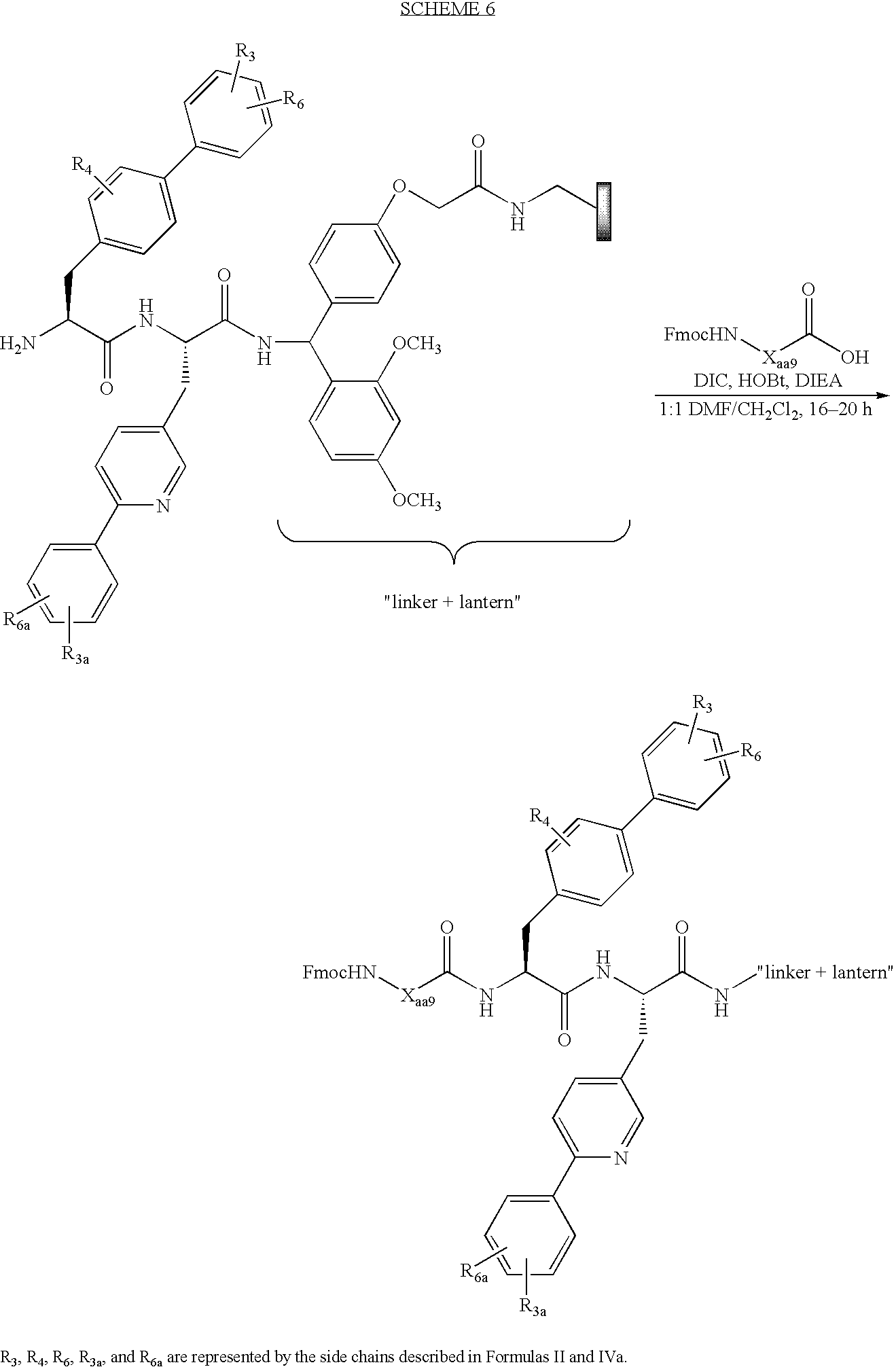 Where R and R′ are as discussed herein. Unless otherwise indicated, the term “amino acid” as employed herein alone or as part of another group includes, without limitation, an amino group and a carboxyl group linked to the same carbon, referred to as “α” carbon, where R and/or R′ can be a natural or an un-natural side chain, including hydrogen. The absolute “S” configuration at the “α” carbon is commonly referred to as the “L” or “natural” configuration. In the case where both the “R” and the “R substituents” equal hydrogen, the amino acid is glycine and is not chiral.