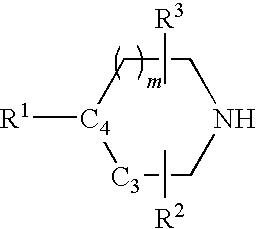 In an alternative embodiment, m is 0 so as to result in a pyrrolidine ring or a 3-pyrroline, when C3-C4 is a single bond or a double bond, respectively. Bicyclic analogues of pyrrolidine ring or a 3-pyrroline are further included. In a further suitable embodiment, m is 2 so as to form a 7-membered ring. In a particular embodiment, m is 1.