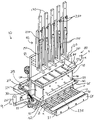 For the hopper unit 99, each fixed wall 350 of each vertical passageway 675 is shown so as to be substantially vertical. Each movable wall 360 is positioned at a slight angle relative to vertical, such that the width of the vertical passageway 675 is slightly greater near the bottom than near the top. For example, each movable wall 360 is positioned at an angle of 1° off vertical, tapering outwards toward its bottom. In different embodiments, any or all of the walls 350, 360 may be vertical or slightly angled, but in preferred embodiments, the movable walls 360 are at least slightly angled. The weights 177 of the hopper assembly 80 are shown in a lowered position, such that each weight 177 extends within the corresponding vertical passageway 675 of the hopper unit 99.