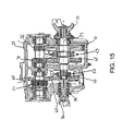- the primary hydraulic pump and motor have respective rotational drive shafts extending parallel to the power input and output drive shafts, and a plurality of hydraulic motors are mounted to the second axial end of the housing.