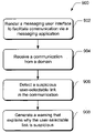 At block 906, a suspicious user-selectable link is detected in the communication. For example, the detection module 220 (FIG. 2) can detect that a suspicious user-selectable link may be any one of a network-based resource, a URL (Uniform Resource Locator), and/or an email address. The user-selectable link can be detected as being similar to a known fraudulent target, or can be included as part of a suspicious sender address or display name.