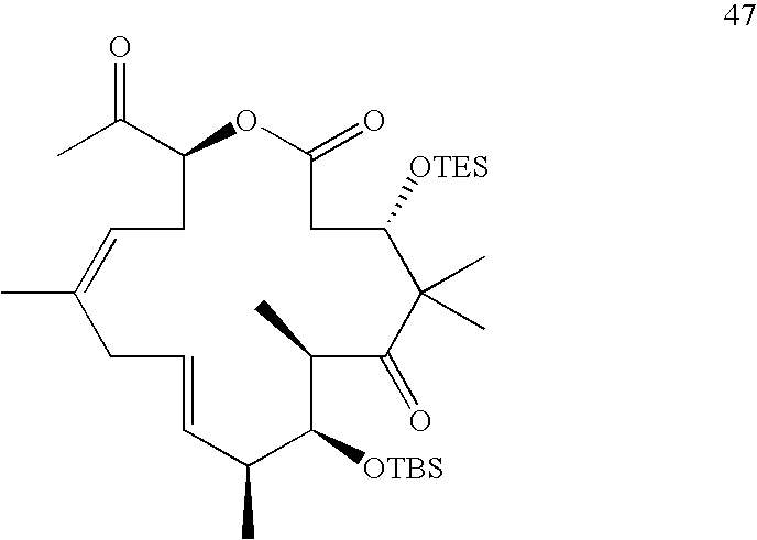 Compound 47: To a solution of compound 45 (20 mg, 0.031 mmol) in dry toluene (60 mL) at reflux was added in one portion a solution of tricyclohexylphosphine[1,3-bis(2,4,6-trimethylphenyl)-4,5-dihydroimidazol-2-ylidene][benzylidene]ruthenium (IV) dichloride (5.2 mg, 0.0061 mmol) in dry toulene (2 mL) and heated for 10 minutes. The reaction mixture was cooled immediately in ice bath and stripped onto silica and purified using silica gel chromatography employing 4–10% EtOAc/pentane gradient as the eluent to furnish compound 47 (15 mg, 78% yield) as an oil: [α]−28.6 (c 1.2, CHCl3); IR (neat) 2955, 2933, 2878, 1745, 1731, 1695, 1471, 1462, 1380, 1361, 1251, 1159, 1104, 1080, 1019, 985.0, 876.1, 835.5, 774.7, 743.1, 670.1 cm−1; 1H NMR (500 MHz, CDCl3) 0.07 (3H, s), 0.10 (3H, s), 0.59–0.68 (6H, m), 0.91 (9H, t, J=8.0 Hz), 0.93 (9H, s), 1.04 (3H, d, J=7.0 Hz), 1.10 (3H, s), 1.11 (3H, d, J=7.0 Hz), 1.17 (3H, s), 1.71 (3H, s), 2.21 (3H, s), 2.27–2.32 (1H), 2.38 (1H, dd, J=14.6, 6.8 Hz), 2.51–2.61 (2H, m), 2.57 (1H, dd, J=15.5, 3.3 Hz), 2.93–3.1 (3H, m), 3.94 (1H, d, J=8.5 Hz), 4.28 (1H, dd, J=8.6, 3.0 Hz), 5.04 (1H, dd, J=8.7, 2.4), 5.16 (1H, t, J=7.5), 5.73 (1H, tdd, J=12.8, 9.94, 6.9 Hz), 5.92 (1H, ddd, J=18.0, 10.3, 7.8 Hz); 13C NMR (125 MHz, CDCl3) δ 215.9, 204.8, 171.3, 140.0, 132.7, 129.2, 118.6, 79.1, 78.2, 75.4, 54.0, 48.2, 41.7, 40.3, 35.0, 29.2, 26.6, 26.5, 23.5, 22.8, 20.6, 18.8, 17.5, 14.3, 7.19, 5.53, −3.36; LRMS (ESI) calcd. for C34H62O6Si2645.4, found 645.4 (M+Na+).